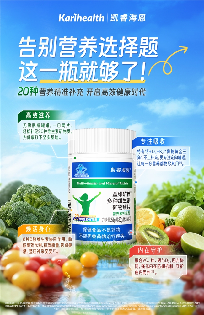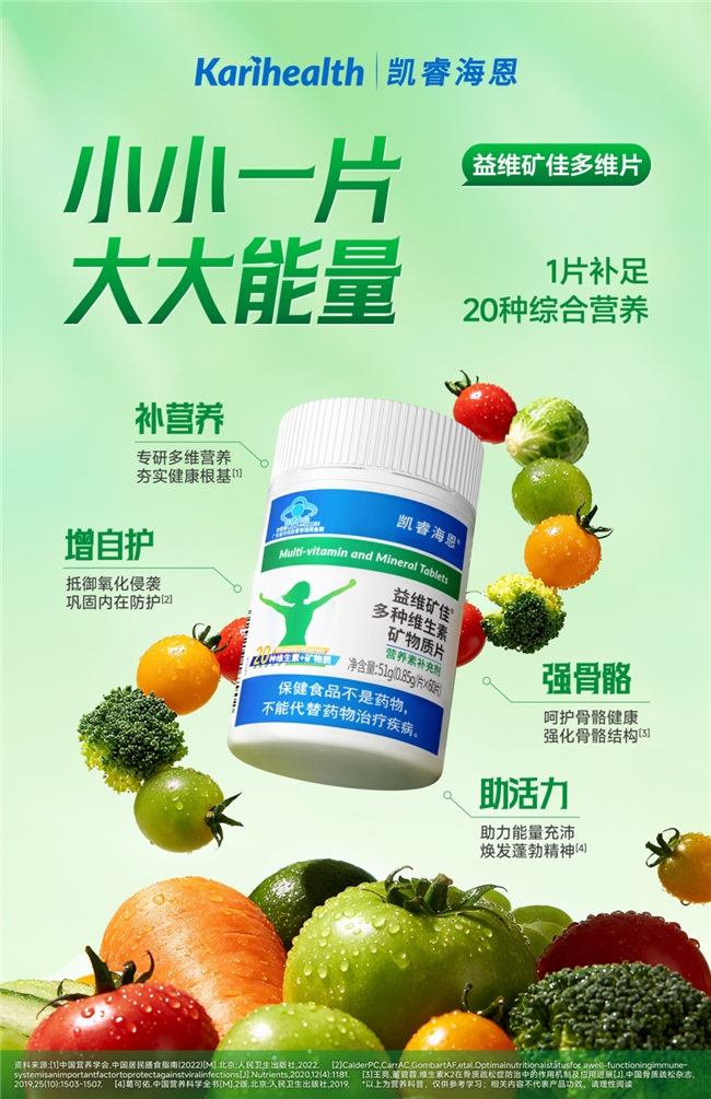 钙、镁、锰、铁、锌、硒、铜、8种维生素B、维生素A、维生素D3、维生素C、维生素K2、维生素E,凯睿海恩益维矿佳多维片,小小一片里就囊括了这20种关键营养素,每日两片,精准覆盖当下人群多维营养需求与日常膳食缺口,从容守护您的健康生活,赋能每个精彩瞬间。